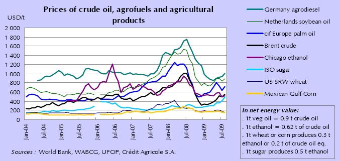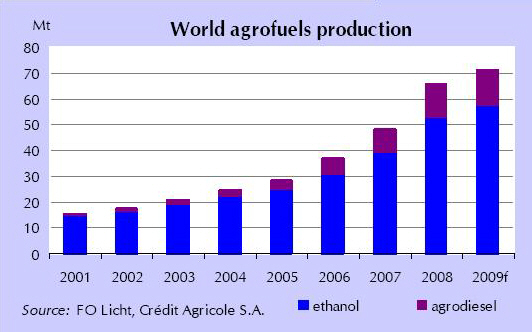 Τόσο η παραγωγή αιθανόλης, υποκατάστατου του πετρελαίου που παράγεται από τη ζάχαρη ή τα δημητριακά, όσο και του βιοντίζελ, που παράγεται από φυτικά έλαια, συνέχισε να καταγράφει αύξηση και το 2008 και το 2009. Για το τρέχον έτος όμως, η πρόβλεψη για αυξημένη συνολική παραγωγή κατά 8% μοιάζει εξαιρετικά χαμηλή σε σχέση με το +36% του 2008 ή το +30% των ετών 2007 και 2006.