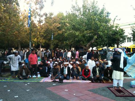 μια υποτίθεται ευρωπαϊκή πρωτεύουσα. Η προσευχή των μουσουλμάνων ...στα προπύλαια του Πανεπιστημίου και σε πλατείες δεν τιμά ούτε εμάς τους πολίτες αυτής της χώρας,ούτε και τους μουσουλμάνους που επέλεξαν αυτό το τρόπο για να προσευχηθούν. Ο σεβασμός στο δικαίωμα κάθε ανθρώπου να πιστεύει στο Θεό του και να προσεύχεται σ΄ αυτόν είναι αναφαίρετο. Άλλο αυτό κι άλλο οι ακρότητες απ΄ όπου κι αν προέρχονται.Πριν από αρκετά χρόνια ,σαν χθες,το 1988,η Αθήνα «καιγόταν» από το πάθος φανατικών Χριστιανών που δεν ήθελαν να προβληθεί η ταινία «Ο τελευταίος πειρασμός»! Σήμερα η μαζική δημόσια προσευχή των μουσουλμάνων δίνει πάλι την αίσθηση ότι αυτή η πόλη αντί να πηγαίνει μπροστά,γυρνάει πολλούς αιώνες πίσω.