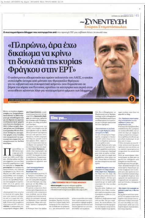 Ο ίδιος υποστηρίζει ότι αφού πληρώνει για την ΕΡΤ,έχει το δικαίωμα να κάνει κριτική στην τηλεοπτική εκπομπή της κόρης του Α/ΓΕΣ. Κατά τ΄ άλλα ο συνταγματάρχης είναι αρκετά προσεκτικός στα όσα λέει στη συνέντευξή του.