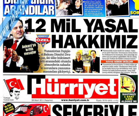 Συνέντευξη στην τουρκική εφημερίδα Hürriyet έδωσε ο Υπουργός Εξωτερικών Δημήτρης Δρούτσας. Η Ηürriyet στο πρωτοσέλιδο της με τίτλο " τα 12 μίλια είναι το νόμιμο δικαίωμα μας" κάνει αναφορά στις δηλώσεις Δρούτσα.Ο υπουργός Εξωτερικών στη συνέντευξη του στην τουρκάλα δημοσιογράφο Τζανσού Τσαμλίμπελ στέλνει μήνυμα στην Τουρκία και τονίζει " υπογράψτε τη Διεθνή Σύμβαση του δικαίου της Θάλασσας και τότε να πάμε το θέμα της υφαλοκρηπίδας στη Χάγη.