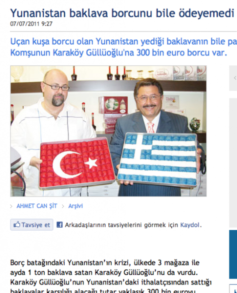 Η τουρκική εφημερίδα Radikal κάνει αναφορά στο θέμα με την γνωστή εταιρεία παραγωγής μπακλαβάδων « Güllüoğlu» που πριν από περίπου 8 χρόνια είχε ανοίξει 3 υποκαταστήματα στην Αθήνα. « Η κρίση της Ελλάδας που πνίγεται στα χρέη χτύπησε και την εταιρεία Güllüoğlu που πουλούσε τον μήνα έναν τόνο μπακλαβά στην Ελλάδα.» γράφει τη τουρκική εφημερίδα και τονίζει πως ο έλληνας αντιπρόσωπος της εταιρείας χρωστά στην τουρκική εταιρεία Güllüoğlu 300.000 Eυρώ τα οποία δεν μπορεί μέχρι στιγμής να τα πληρώσει.