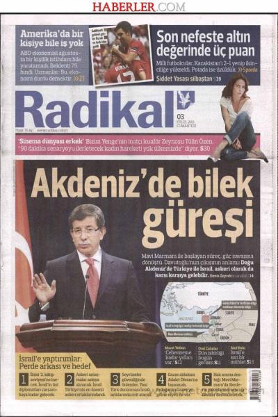 "Μπρα ντε φερ στη Μεσόγειο" είναι ο τίτλος της εφημερίδας Radikal που τονίζει πως Τουρκία και Ισραήλ μπορούν να φτάσουν σε σημείο 'ενοπλης σύγκρουσης.