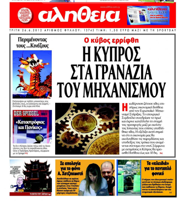 Η υποβολή αίτησης εκ μέρους της Κυπριακής Δημοκρατίας για ένταξη στο Μηχανισμό στήριξης είναι το κύριο θέμα στα πρωτοσέλιδα των περισσοτέρων εφημερίδων. Προβάλλονται επίσης οι συνεχιζόμενες έρευνες για το πενταπλό φονικό στην Αγία Νάπα, οι επαφές του Υπουργού Εμπορίου στην Κίνα, καθώς και οι συναντήσεις Αναστασιάδη σε Βερολίνο και Βρυξέλλες.