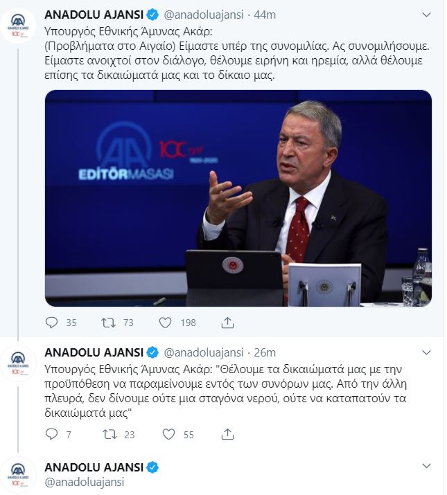 Πάντως, ιδιαίτερο ενδιαφέρον έχει το γεγονός πως το τουρκικό πρακτορείο ειδήσεων Anadolu έχει αναρτήσει tweets στην ελληνική γλώσσα όπου από την πλευρά ο Akar διαμηνύει πως «δεν δίνουμε ούτε σταγόνα νερού, ούτε να καταπατούν τα δικαιώματα μας»