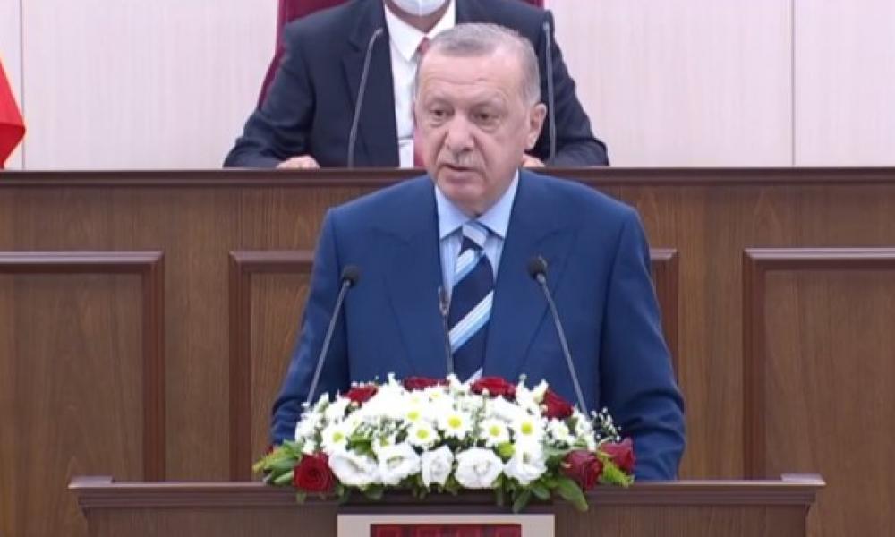 Προκλητικός ως αναμενόταν ο Ερντογάν εντός της ψευδοβουλής επανέλαβε το αφήγημά του, περί λύσης δυο κρατών.