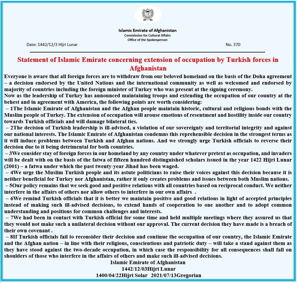 “Έχουμε ζητήσει επανειλημμένα από την Τουρκία να αποχωρήσει από το Αφγανιστάν, όμως δεν έχει φύγει κανένας (στρατιωτικός). Αυτή είναι η τελευταία και τελική προειδοποίηση του Ισλαμικού Εμιράτου του Αφγανιστάν “Ταλιμπάν” προς τις τουρκικές δυνάμεις, να μην παραμείνουν και να αποχωρήσουν από το Αφγανιστάν, πριν αρχίσουν οι στρατιωτικές επιχειρήσεις εναντίον τους”. (Και η συνεννόησή μας πρέπει να είναι ξεκάθαρη)
