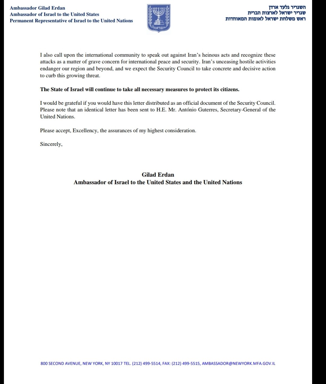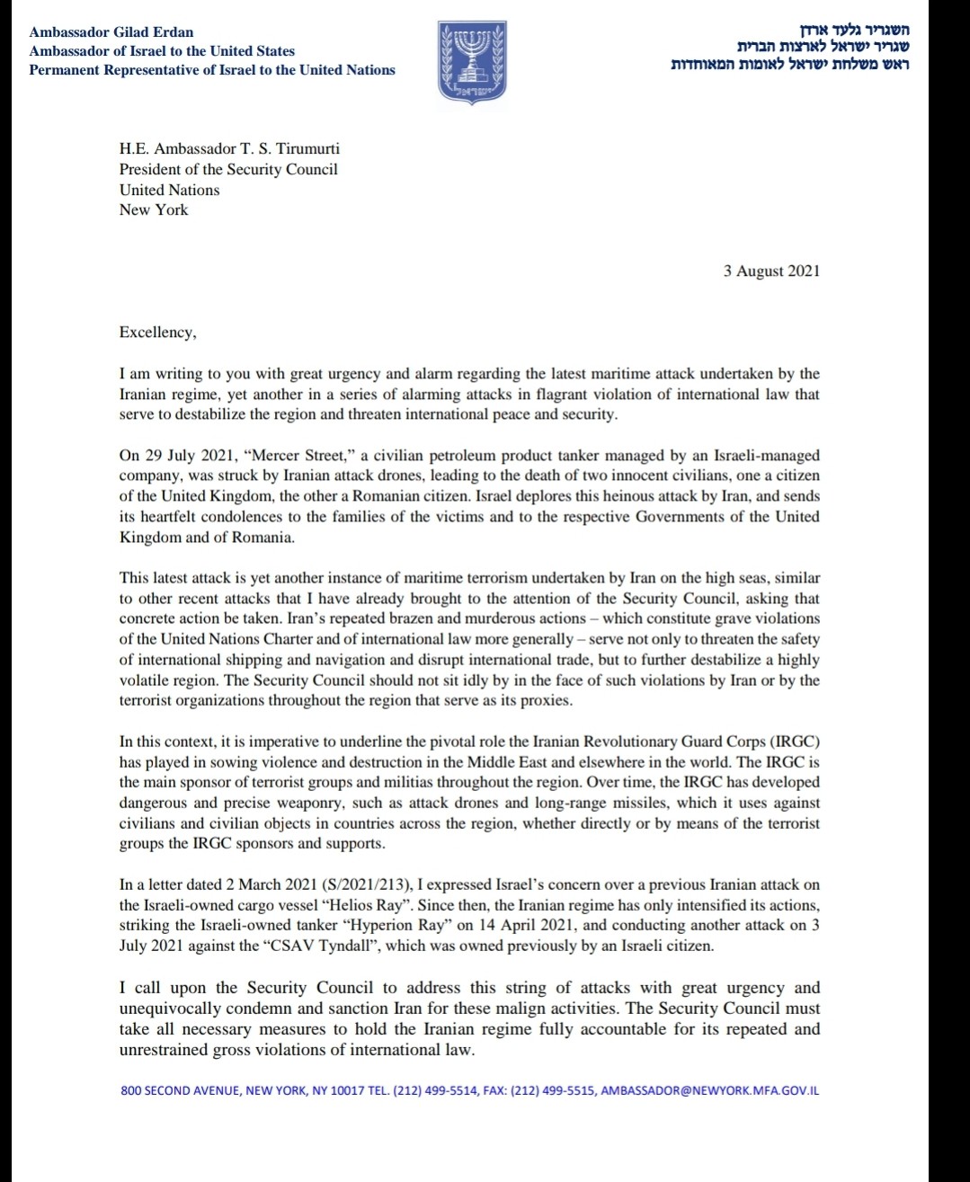 Ο Πρεσβευτής του Ισραήλ στον ΟΗΕ, Γκιλάντ Ερντάν έστειλε επιστολή στο Συμβούλιο Ασφαλείας, ζητώντας να αντιμετωπιστούν επειγόντως τα ναυτικά επεισόδια και να καταδικαστεί το Ιράν για την επίθεση με μη επανδρωμένο αεροσκάφος στο τάνκερ “Mercer Street”.