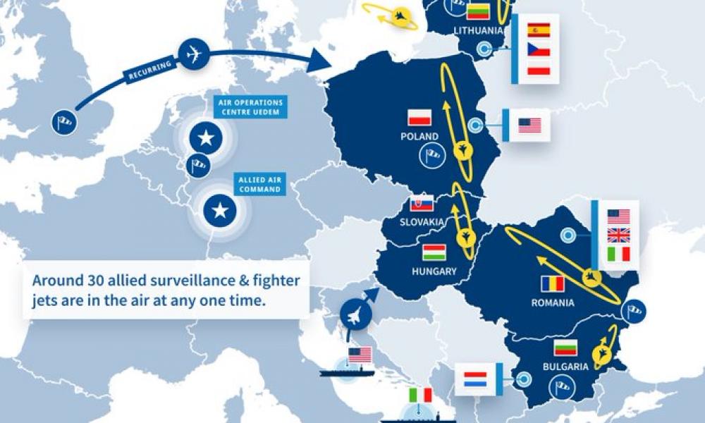 Έτσι μαχητικά που τελούσαν σε κατάσταση Συναγερμού-Άμεσης Αντίδρασης (QRA) από την Πολωνία, τη Δανία, τη Γαλλία και την Ισπανία αναπτύσσονται στον αέρα σε διαφορετικές χρονικές στιγμές στην περιοχή της Βαλτικής Θάλασσας, για την προστασία του συμμαχικού εναέριου χώρου, ενώ στην περιοχή της Μαύρης Θάλασσας, αεροσκάφη QRA από τη Ρουμανία και το Ηνωμένο Βασίλειο περιπολούν για να διερευνήσουν άγνωστα ίχνη που πλησιάζουν τον εναέριο χώρο των Συμμάχων.
