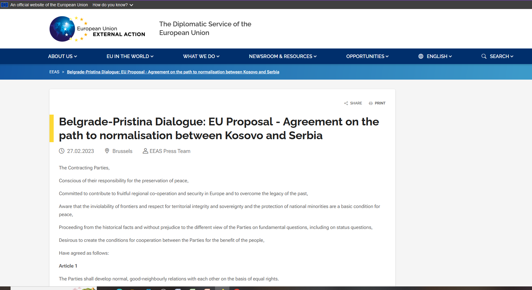 Η Ευρωπαϊκή Ένωση έδωσε στην δημοσιότητα τη Συμφωνία για την εξομάλυνση των σχέσεων ανάμεσα στην Σερβία και το Κόσοβο, την οποία αποδέχθηκαν και οι δύο πλευρές.Ο πρόεδρος της Σερβίας Vucic και ο πρωθυπουργός του Κοσόβου Kurti στην συνάντηση που είχαν, χθες, Δευτέρα 27/2, με τn Ύπατο Εκπρόσωπο Εξωτερικής Πολιτικής της Ένωσης Borrell και τον ειδικό απεσταλμένο για το θέμα του Κοσόβου Μίροσλαβ Λάιτσακ έδωσαν την συγκατάθεση τους για την υλοποίηση της Συμφωνίας.