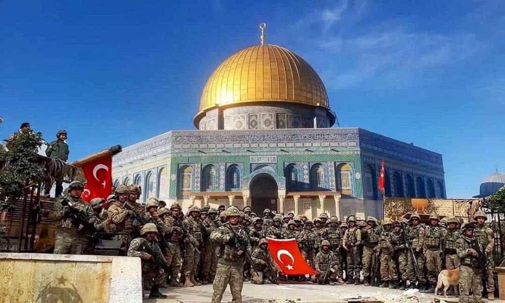 Την ίδια στιγμή “ κατασκευασμένη” φωτογραφία με Τούρκους Στρατιώτες μπροστά από το Τέμενος Αλ Ακτσά κυκλοφορεί στα τουρκικά κοινωνικά δίκτυα, δείχνοντας τις προθέσεις των Τούρκων.