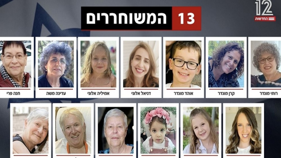 Οι 13 Ισραηλινοί όμηροι που απελευθερώθηκαν από τη Hamas είναι οι: Hannah Katzir (76 ετών), Margalit Mozes (77 ετών), Yafa Ader (85 ετών), Channah Peri (79 ετών), Adina Moshe (72 ετών), Danielle Aloni (45 ετών) και Emilia Aloni (6 ετών), Ruthi Mondar (78 ετών), Keren Mondar (54 ετών) και Ohad Mondar (9 ετών), Aviv Asher (2 ετών), Raz Asher (5 ετών) και Doron Katz-Asher (34 ετών).