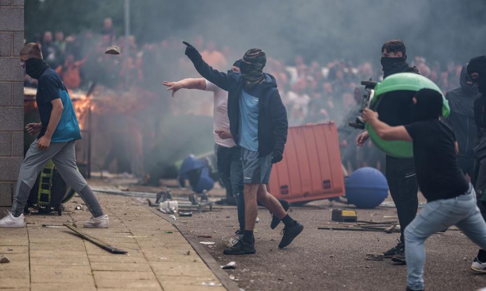 Την ίδια στιγμή χιλιάδες Βρετανοί, πολλοί ντυμένοι με σημαίες της Αγγλίας και μέλη του Union Jack, συγκεντρώθηκαν έξω από ένα ξενοδοχείο που στεγάζει αιτούντες ασύλου στο Ρόθερχάμ την Κυριακή και προσπάθησαν να βάλουν φωτιά στις εγκαταστάσεις.