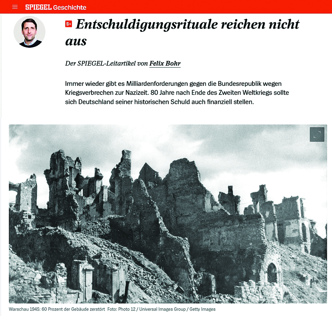 «Οι τελετουργίες συγγνώμης δεν αρκούν» τιτλοφορείται το κύριο άρθρο του «Spiegel» που υπογράφει ο αρχισυντάκτης Φέλιξ Μπορ με αφορμή τη φετινή επέτειο από την ήττα της ναζιστικής Γερμανία. Και από την εισαγωγή κιόλας χτυπάει στο ψαχνό: «Ξανά και ξανά υπάρχουν δισεκατομμύρια σε αξιώσεις κατά της Ομοσπονδιακής Δημοκρατίας της Γερμανίας για εγκλήματα πολέμου κατά τη διάρκεια της ναζιστικής εποχής. Ογδόντα χρόνια μετά το τέλος του Β΄ Παγκοσμίου Πολέμου η Γερμανία θα πρέπει επίσης να αντιμετωπίσει οικονομικά το ιστορικό της χρέος»…