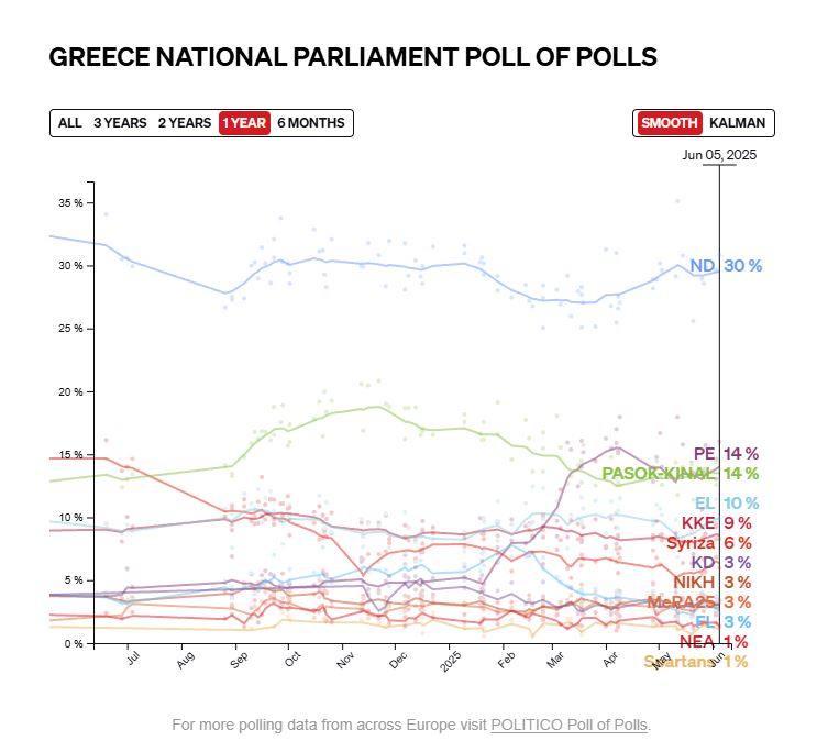 Παρότι η ΝΔ κινείται γύρω από το 29%, πολύ κάτω από την απαιτούμενη πλειοψηφία, το Politico διαπιστώνει ότι εξακολουθεί να προηγείται. Κι αυτό γιατί απλώς... δεν υπάρχει εναλλακτική.