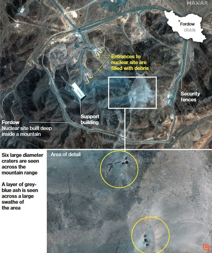 Ο Τραμπ διέταξε τη χρήση βομβαρδιστικών B-2 με βόμβες GBU-57, γνωστές και ως Massive Ordnance Penetrators, για την καταστροφή των υπόγειων εγκαταστάσεων εμπλουτισμού ουρανίου στη Νατάνζ και στη Φορντό. Δορυφορικές εικόνες που διανεμήθηκαν από τη Maxar Technologies και λήφθηκαν στις 22 Ιουνίου, δείχνουν σημαντικούς νέους κρατήρες στο Φορντό, έναν από τους πιο οχυρωμένους πυρηνικούς χώρους του Ιράν. Ωστόσο, μια μεγάλη υποστηρικτική εγκατάσταση, η οποία χρησιμοποιείται για τον έλεγχο του αερισμού των υπόγειων χώρων εμπλουτισμού, παρέμεινε ανέπαφη, ενώ δεν αναφέρθηκαν εκπομπές ακτινοβολίας από την ΙΑΕΑ.