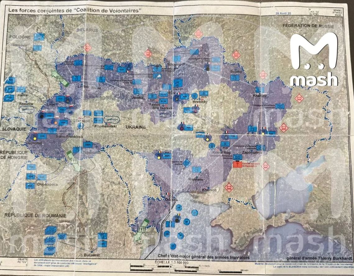 Από τον χάρτη της κατοχής της Ουκρανίας που απέκτησαν οι χάκερ μετά από παραβίαση του γραφείου των Ένοπλων Δυνάμεων της Γαλλίας, η «Συμμαχία των Προθύμων» σχεδιάζει να αναπτύξει στην επικράτεια της Ουκρανίας περίπου 50.000 στρατιώτες από χώρες της ΕΕ και του ΝΑΤΟ.